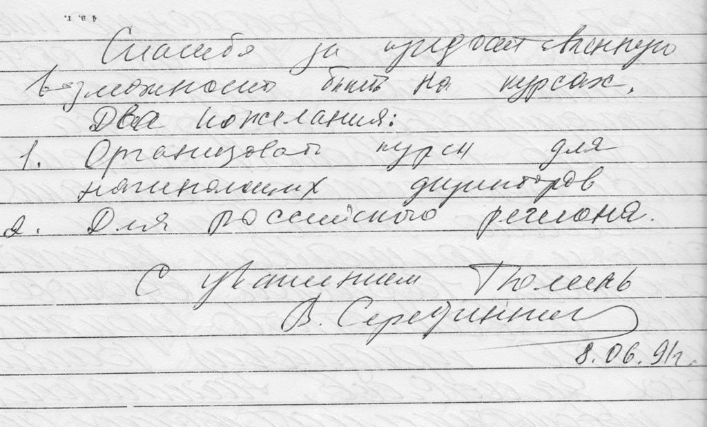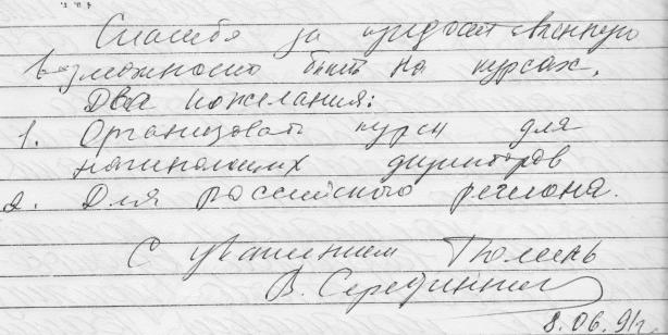 Відгук про роботу та побажання до вдосконалення організації навчання директора музичної школи з Тюмені, старости І групи В.Серебрянного