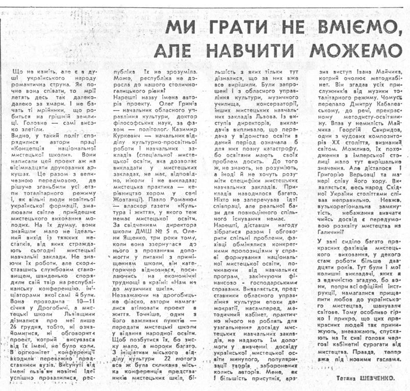 Розуміючи всю хибність концепції О.І.Гриніва, члени Президії, під час її обговорення, висловили свою жорстку позицію, спрямовану на недопущення перепідпорядкування мистецьких шкіл Міністерству освіти. Позицію членів Президії підтримала більшість присутніх на семінарі-нараді, і концепція не була втілена в життя. Так висвітлювала ці події Львівська обласна газета «Ратуша»: