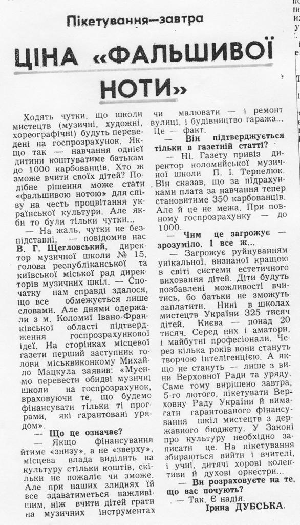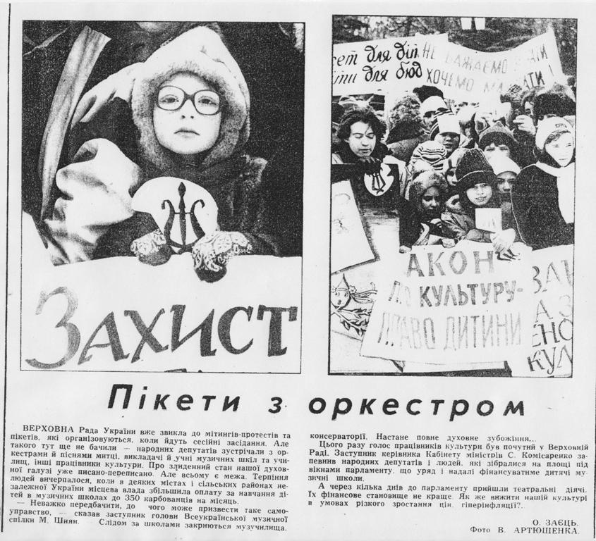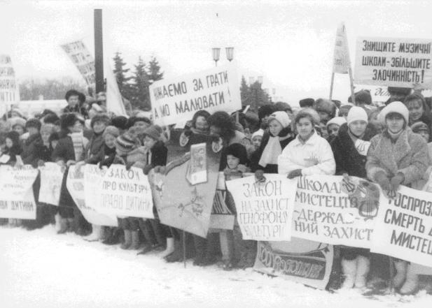 У день пікетування ВР, 5 лютого 1992 року, на площі біля Верховної Ради зібралися педагогічні та учнівські колективи мистецьких шкіл м. Києва, столичні творчі колективи. Перед входом до Верховної Ради, привертаючи увагу Народних Депутатів, відбулися виступи дитячих творчих колективів музичних шкіл м. Києва. Силами учнів та викладачів художніх шкіл було виготовлено плакати, на яких написані звернення до Народних Депутатів України.