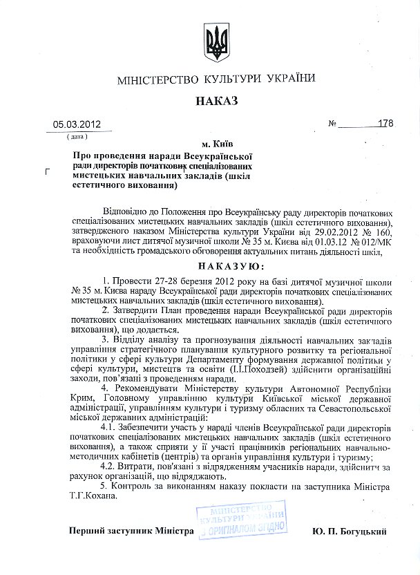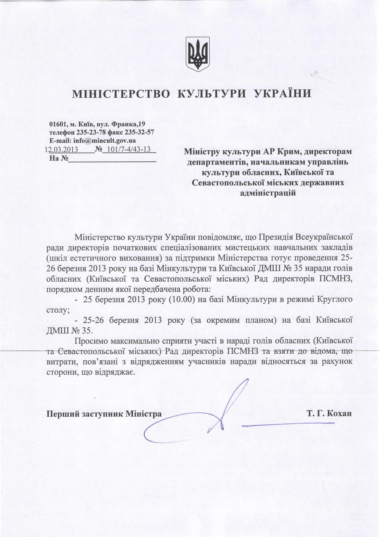 Лист Міністерства культури України про проведення наради Всеукраїнської ради директорів початкових спеціалізованих мистецьких навчальних закладів (шкіл естетичного виховання)