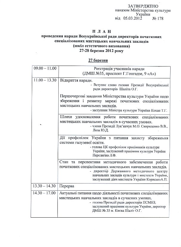 План проведення наради Всеукраїнської ради директорів початкових спеціалізованих мистецьких навчальних закладів (шкіл естетичного виховання)