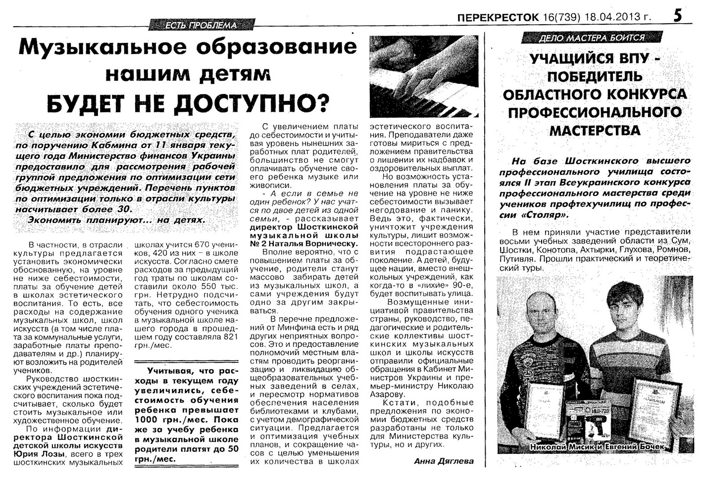 Статья Анны Дяглевой в газете "Перекресток" от 18.04.2013 г.