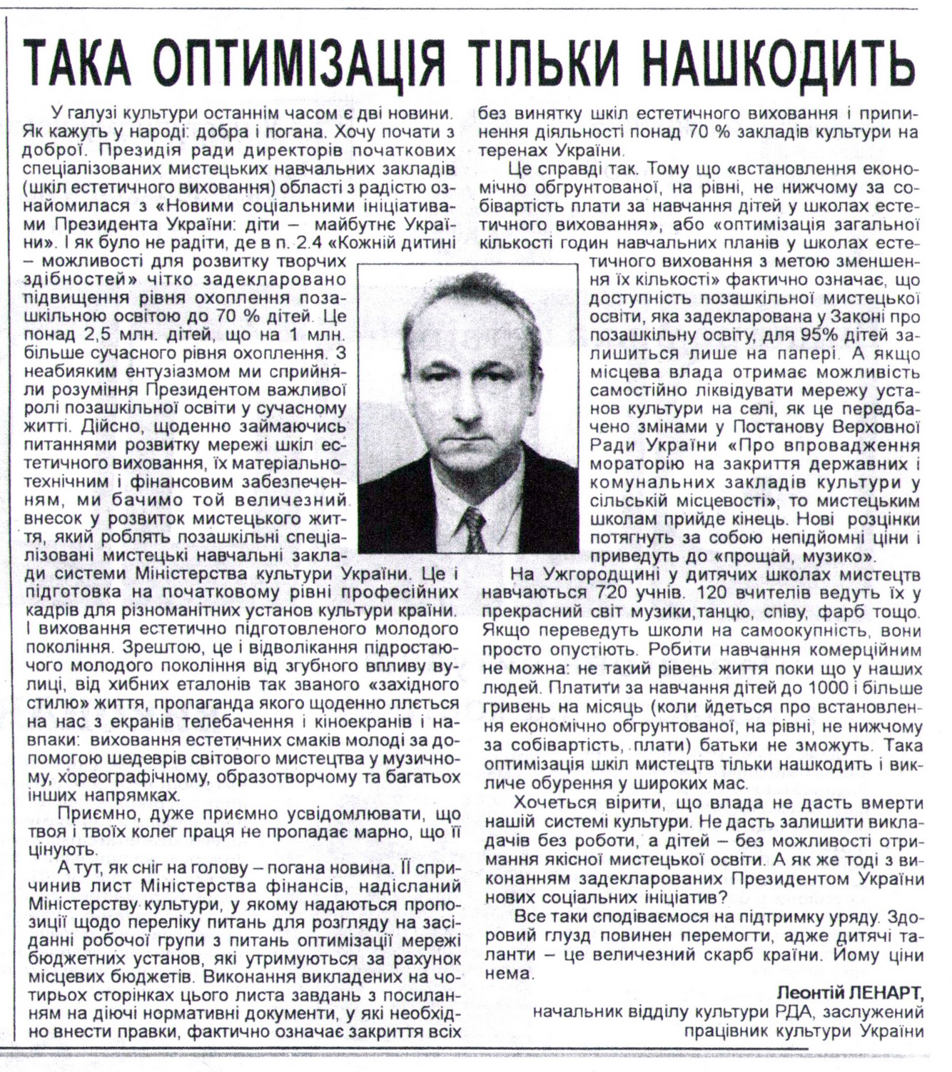 Стаття начальника відділу культури РДА, заслуженого працівника культури України Леонтія ЛЕНАРТА. Закарпаття.